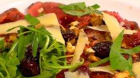 - A burgonyát és a répát hámozzuk meg, a krumplit karikázzuk fel, a répát vágjuk hasábokra. Az almát mossuk meg, magozzuk ki, a húsát cikkezzük fel. Forgassuk össze mindet a megmaradt olajos keverékkel.