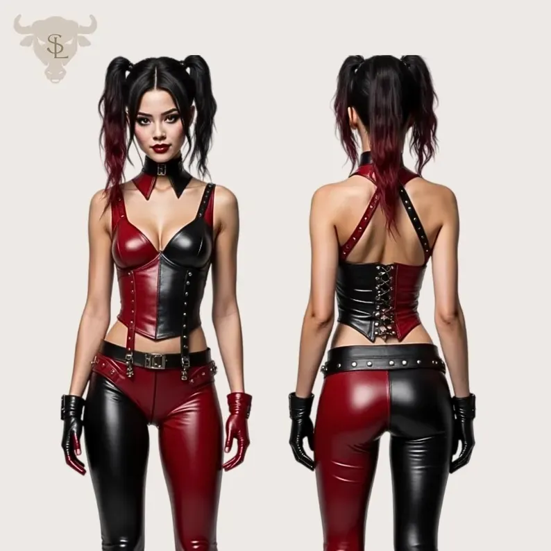 Harley Quinn jelmez a 2021-es Öngyilkos osztagból, aszimmetrikus és bőrből készült változatban. Ez a jelmez azt üzeni: a szórakozást komolyan gondolod, és te döntöd el, ki nevet a végén.