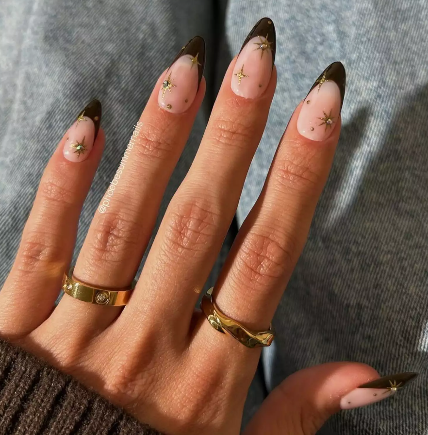 Egy kis varázslat a kezeden is elfér ebben az időszakban, az arany csillagokat pedig komolyabbá varázsolhatod egy sötét színű francia alappal.