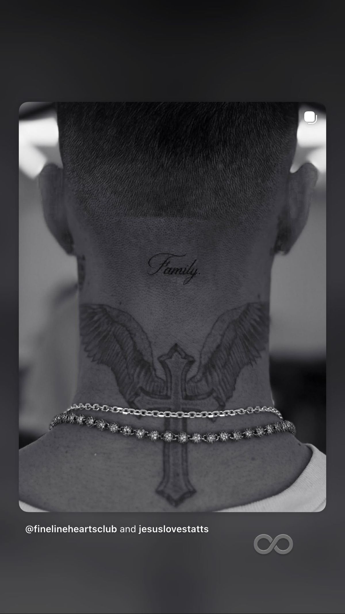 Romeo Beckham válaszul az Instagramon mutatta meg legújabb tetoválását. A Fine Line Hearts Club nevű stúdióban járt, ahol a „family”, vagyis „család” szót tetováltatta a nyakára - pont oda, ahova Brooklyn a felesége szemeit rajzoltatta.