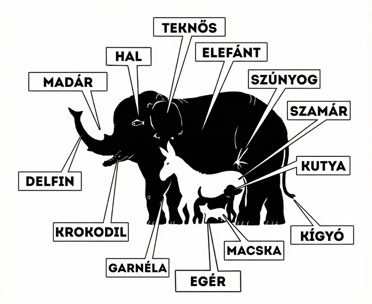 - Elefánt: eddig nem nehéz, benne van elrejtve a többi állat.
