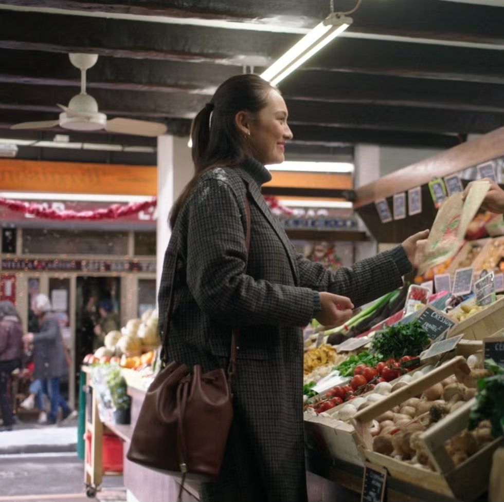 Egy igazi őszi összeállítás. Párizs, a kockás kabát, a burgundi barna táska és a félig felfogott haj mind az őszi hangulatot erősítik.