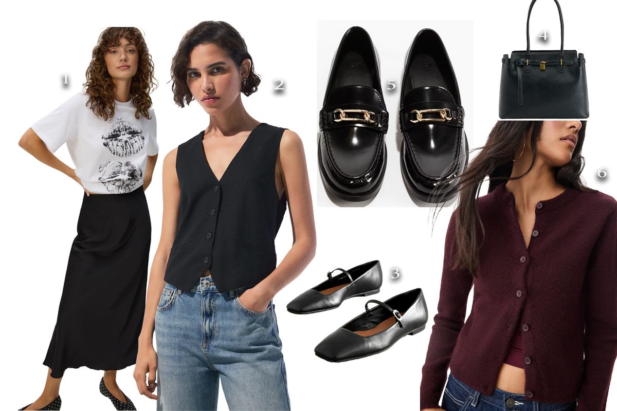 Első összeállításunk egy elegánsabb, visszafogottabb outfit, ami tökéletes viselet lehet a munkahelyedre. Válassz a fekete szoknya fölé egy ujjatlan mellényt és egy kardigánt. A kiegészítők választásánál legyen a mottód: a kevesebb, több. Dönts kisebb, vékonyabb ezüst vagy arany ékszerek mellett. A kedvenc irodai szettedet dobd fel egy oversized oldaltáskával, amibe mindened belefér, ami a munkához szükséges.
