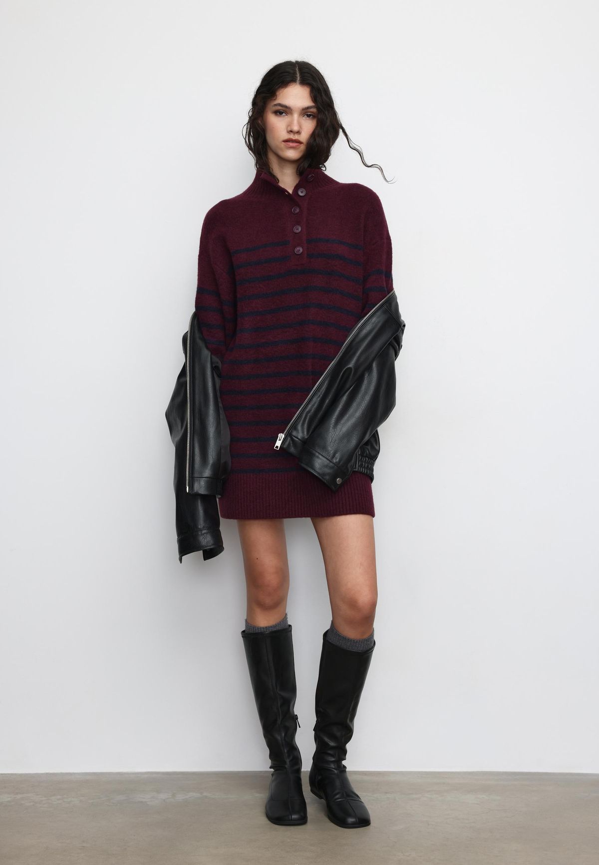 Ha inkább a lazább stílust részesíted előnyben, akkor válaszd ezt a csíkos, rövid ruhát, ami egy bakanccsal és egy fekete harisnyával egyszerű, de nagyszerű outfitet ad.